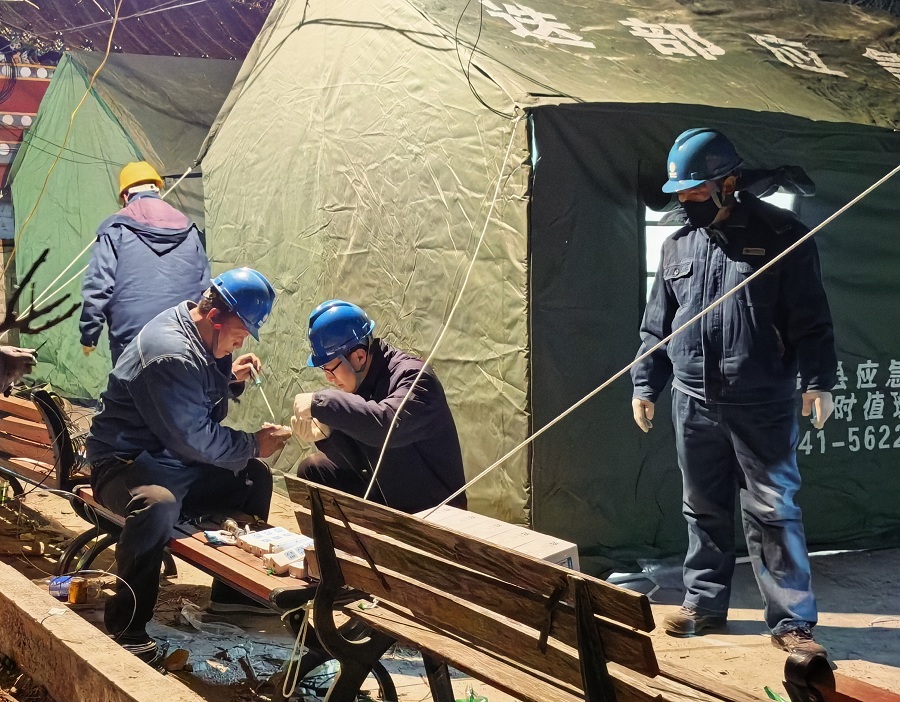 震后第一时间,国网甘肃电力工作人员与时间赛跑,连夜完成临时安置点接电作业。(杨凯 摄)