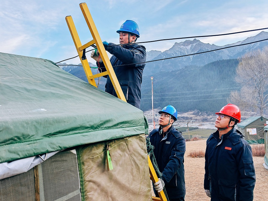 1月28日,国网甘肃电力工作人员在迭部县电尕镇哇曲村临时安置点,为“爱心教室”接通电源。 (李泰昊 摄)