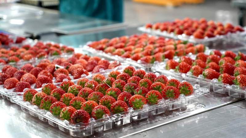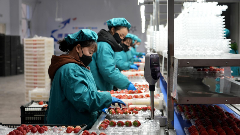 笔者在位于盐锅峡镇盐集村的永靖县农产品加工车间看到,分拣、称重、质检、装箱、入库等工序正有序进行,工人们身着统一工装,熟练地将新鲜采摘的草莓筛选分级,一个个圆润饱满的草莓经精心包装后,装入印有品牌标识的礼盒,即将通过冷链物流直发全国商超,凭借甜度高、耐储运、品质优的特点,深受市场青睐,订单源源不断。