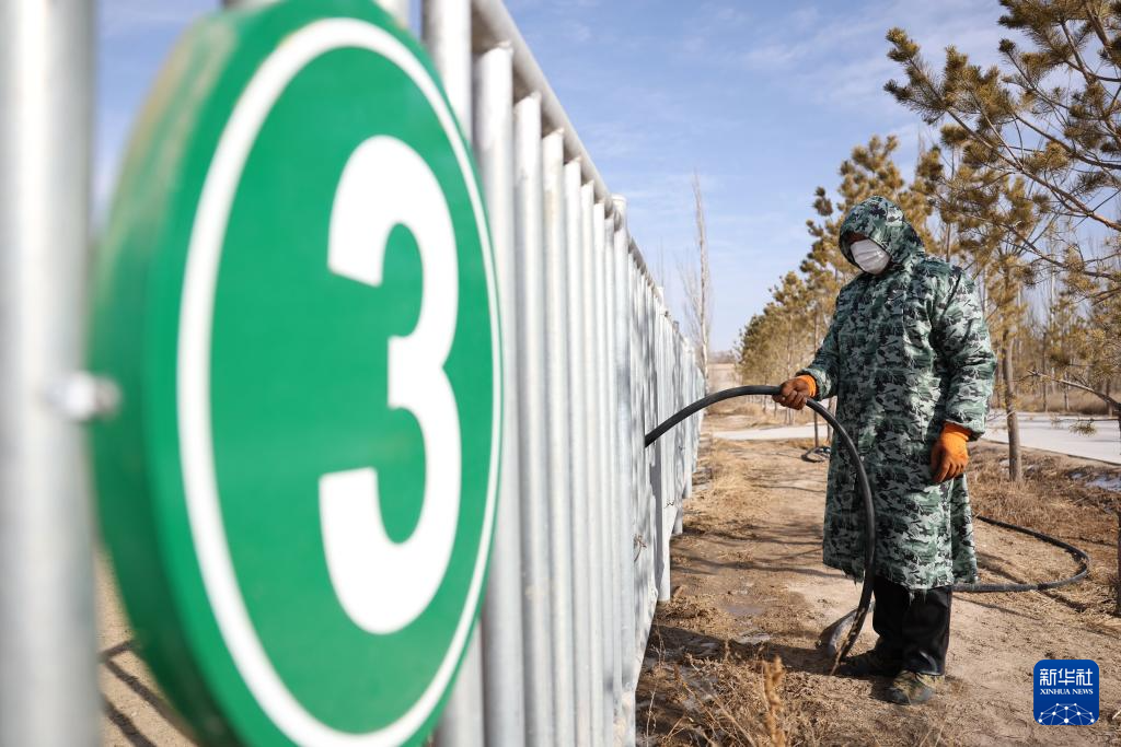 甘肃濒危动物保护中心普氏野马饲养繁育基地工作人员祁金龙在栏杆外为普氏野马的饮水槽加水(2月3日摄)。新华社记者 陈斌 摄