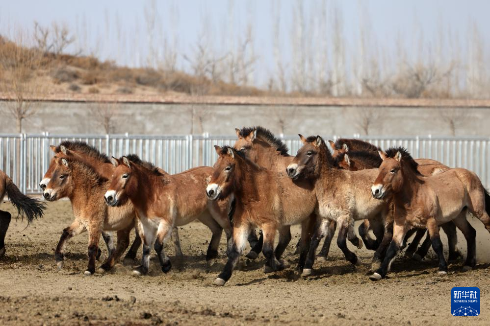 一群普氏野马在甘肃濒危动物保护中心普氏野马饲养繁育基地内奔跑(2月3日摄)。新华社记者 陈斌 摄