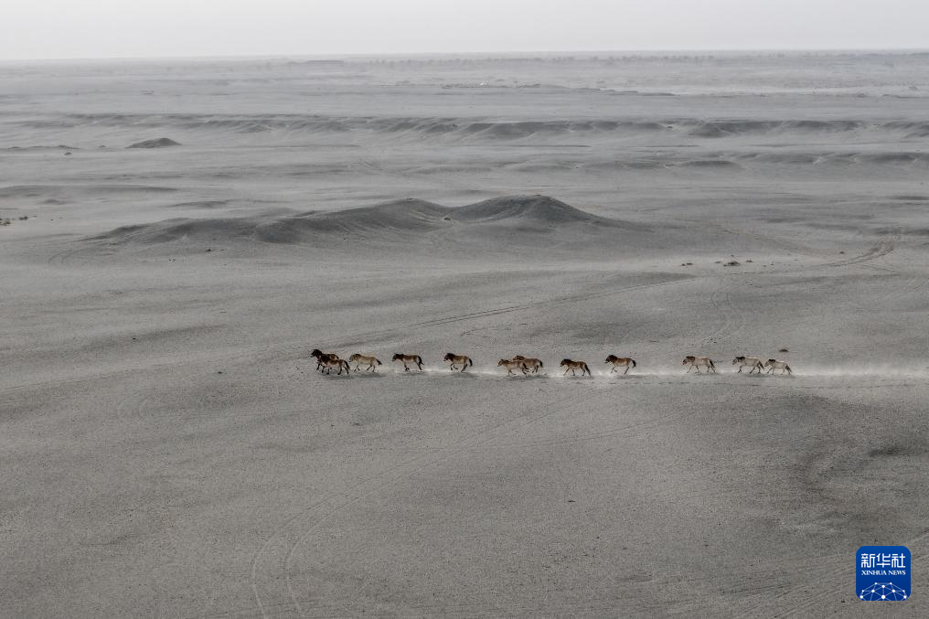 2月5日,一群普氏野马在甘肃敦煌西湖国家级自然保护区的戈壁荒漠上奔跑(无人机照片)。新华社记者 郎兵兵 摄