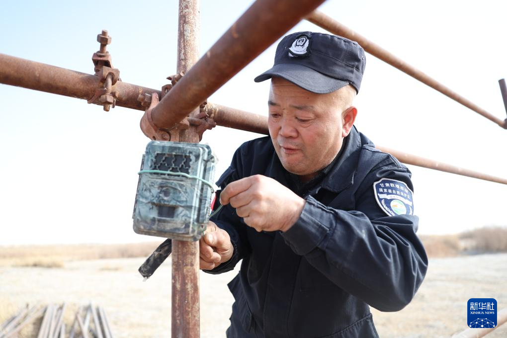 甘肃敦煌西湖国家级自然保护区管护中心玉门关保护站工作人员王成海在保护区内检查红外相机(2月5日摄)。新华社记者 陈斌 摄