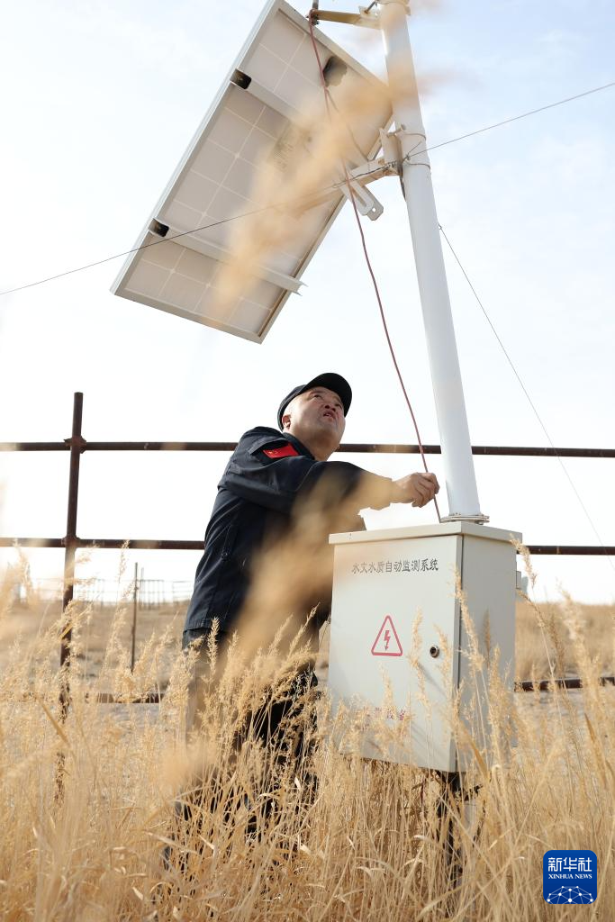 甘肃敦煌西湖国家级自然保护区管护中心玉门关保护站工作人员王成海在保护区内检查水文水质监测设备(2月5日摄)。新华社记者 陈斌 摄