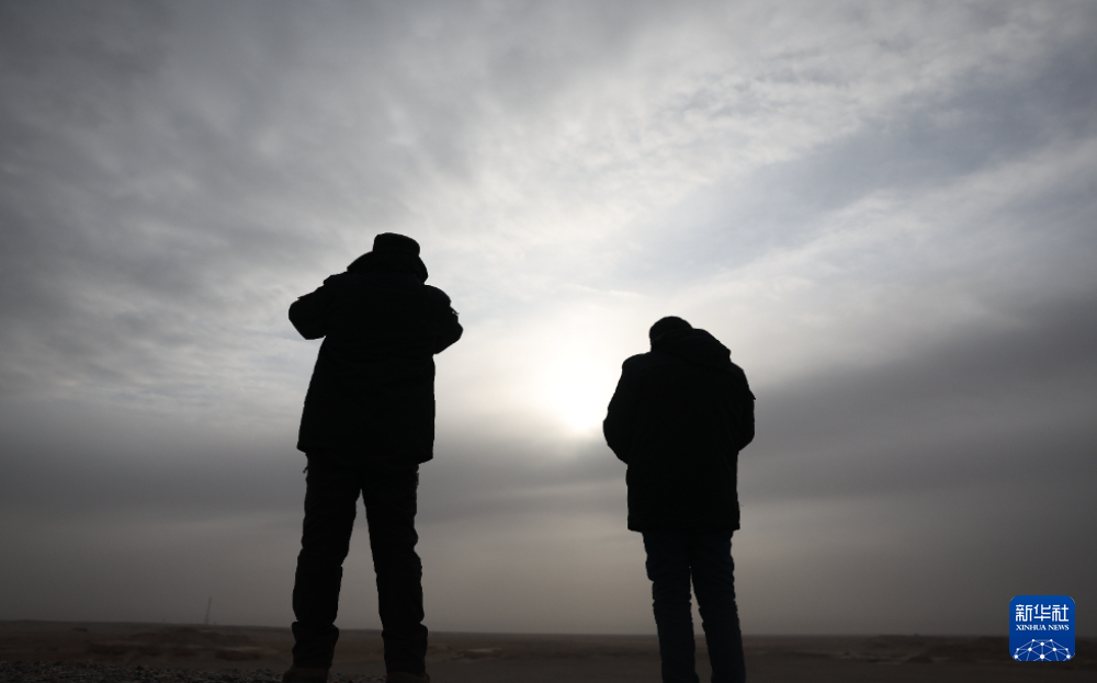 甘肃敦煌西湖国家级自然保护区管护中心玉门关保护站工作人员孙海隆(左)和同事肖永刚在保护区内用望远镜查看普氏野马活动情况(2月5日摄)。新华社记者 陈斌 摄