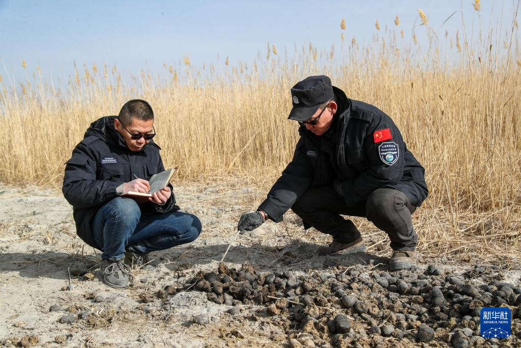 2月5日,甘肃敦煌西湖国家级自然保护区管护中心玉门关保护站工作人员孙海隆(右)和同事肖永刚在保护区内观察记录普氏野马粪便情况。新华社记者 郎兵兵 摄