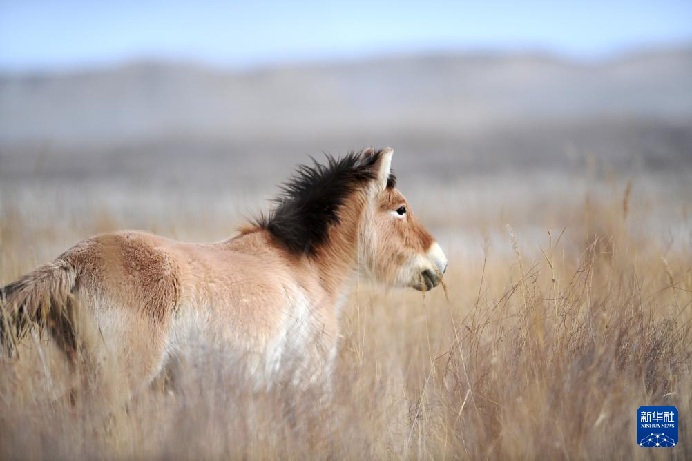 普氏野马在甘肃敦煌西湖国家级自然保护区觅食(2月5日摄)。新华社记者 陈斌 摄