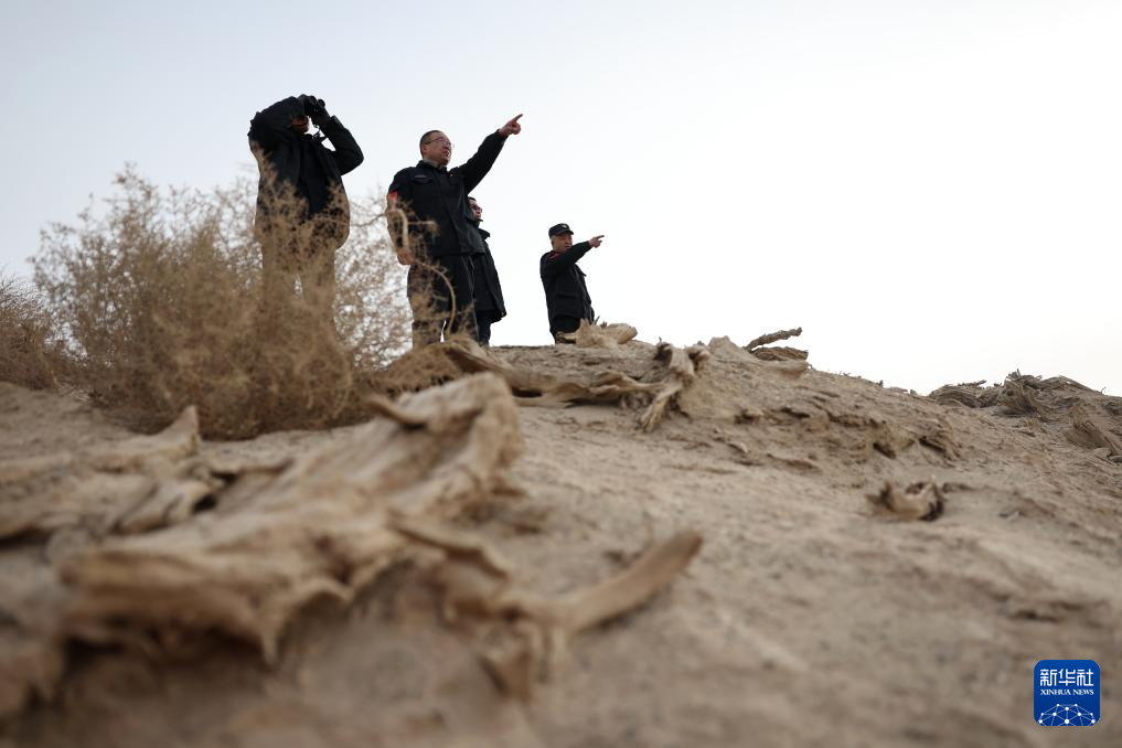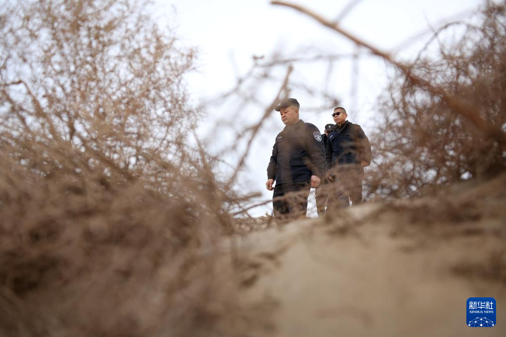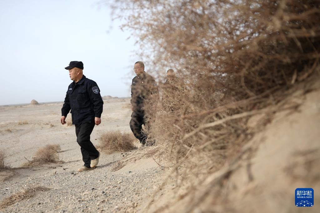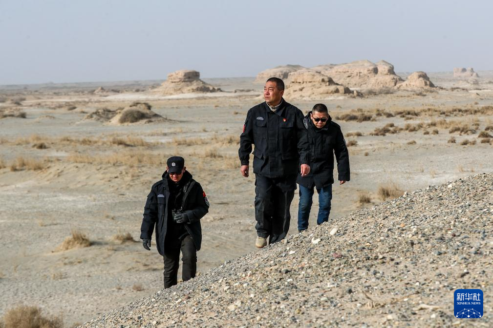 2月5日,甘肃敦煌西湖国家级自然保护区管护中心玉门关保护站站长吴兴东(前)和同事在保护区内巡护。新华社记者 郎兵兵 摄