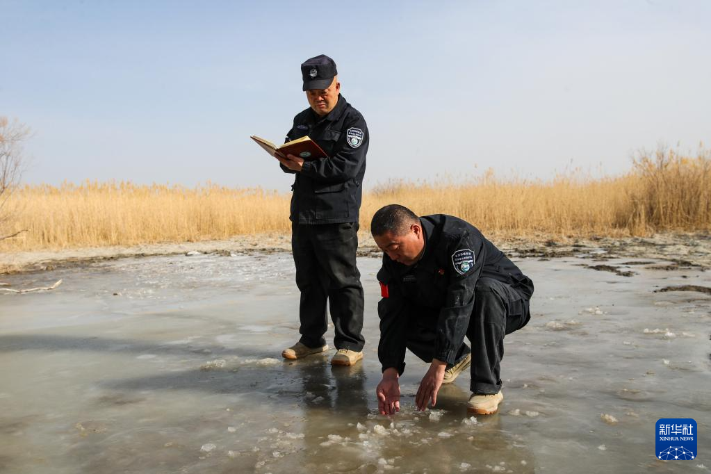 2月5日,甘肃敦煌西湖国家级自然保护区管护中心玉门关保护站站长吴兴东(右)和同事王成海在保护区内观察记录水源地结冰情况。新华社记者 郎兵兵 摄