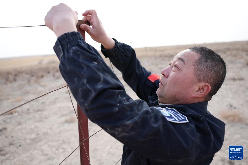 甘肃敦煌西湖国家级自然保护区管护中心玉门关保护站站长吴兴东在保护区内检查围栏(2月5日摄)。新华社记者 陈斌 摄