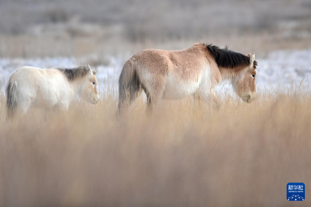 这是2月5日在甘肃敦煌西湖国家级自然保护区内拍摄的普氏野马和小马驹。新华社记者 郎兵兵 摄