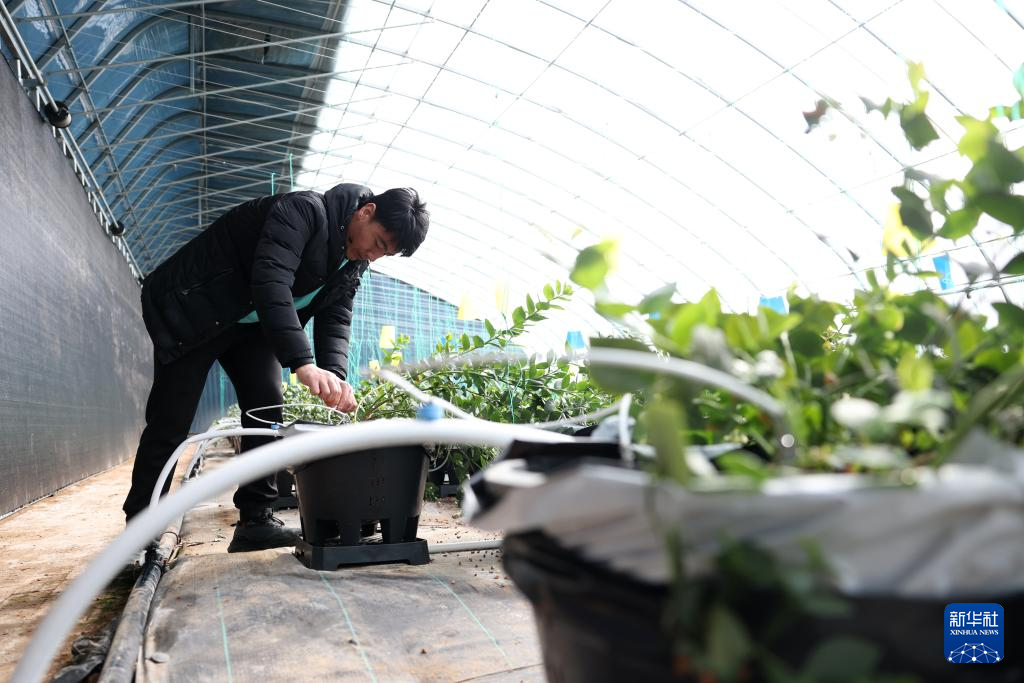 2月12日,一名工人在定西市安定区鲁家沟镇蓝莓种植产业园的温室大棚里查看蓝莓生长情况。新华社记者 陈斌 摄