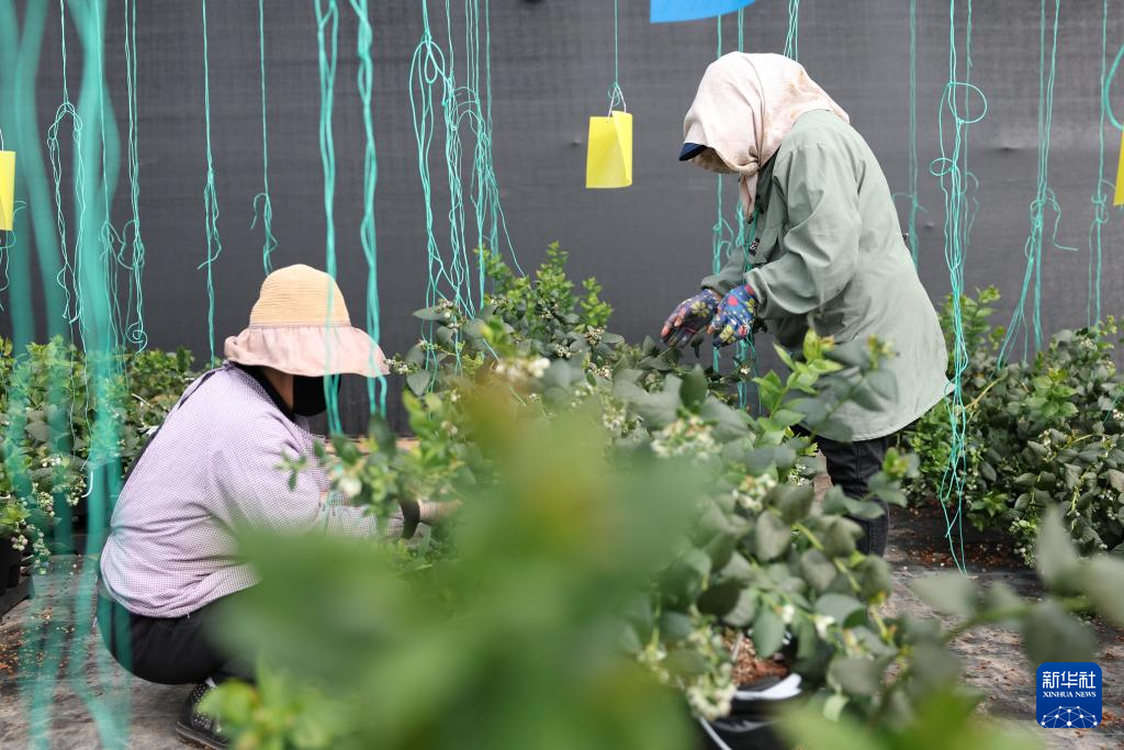 2月12日,两名工人在定西市安定区鲁家沟镇蓝莓种植产业园的温室大棚里查看蓝莓生长情况。新华社记者 陈斌 摄