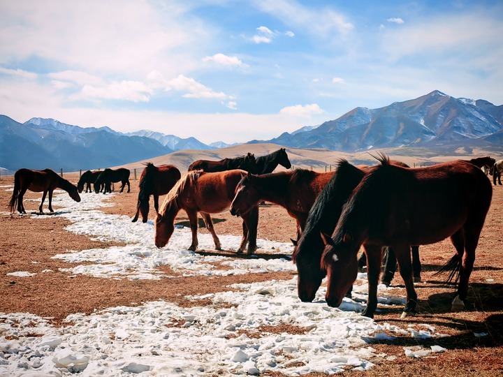 上午10点,我跟着大队马群,绕过冰封沉寂的鸾鸟湖,沿着祁连山融雪汇成的溪流向上游走,眼前便出现一段仍在流动的河面。寒冬未能将其锁住,水声潺潺,水面清亮,成了马群在寒冬中难得的饮水处。