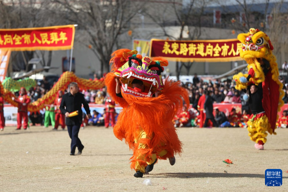 3月3日,社火队员在甘肃省定西市安定区大操场表演舞狮。 新华社发(王克贤 摄)