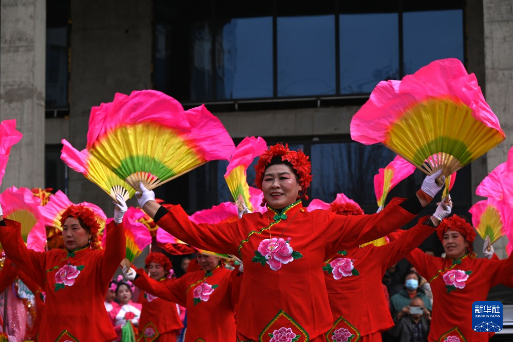 3月3日,社火队员在甘肃省敦煌市城区鸣山路表演。新华社发(张晓亮 摄)