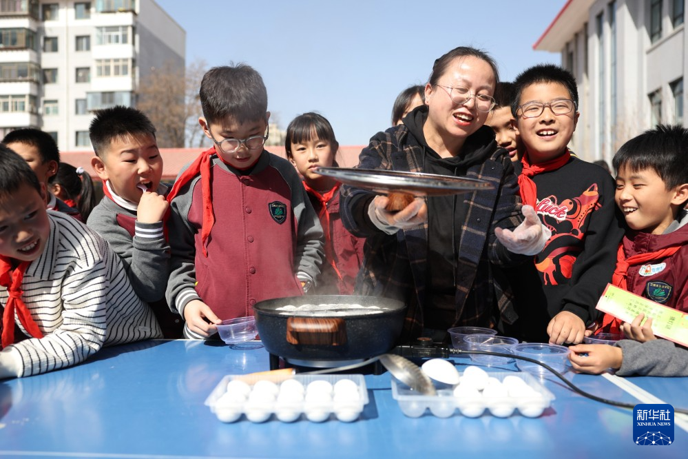 3月3日,甘肃省兰州市东郊学校的学生在校园元宵节民俗活动上煮元宵。新华社记者 陈斌 摄