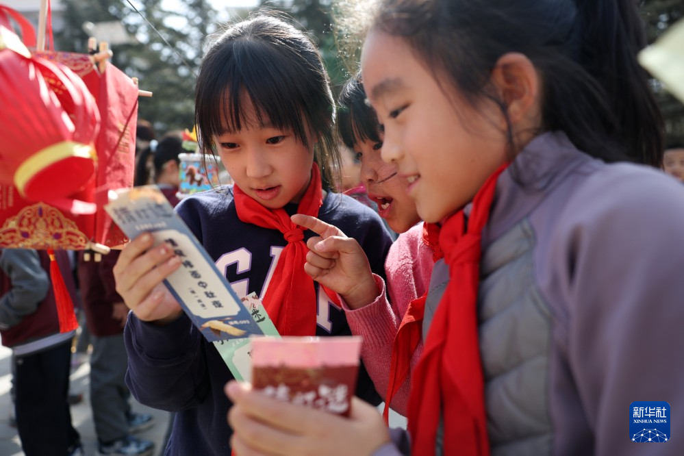 3月3日,甘肃省兰州市东郊学校的学生在校园元宵节民俗活动上猜灯谜。新华社记者 陈斌 摄