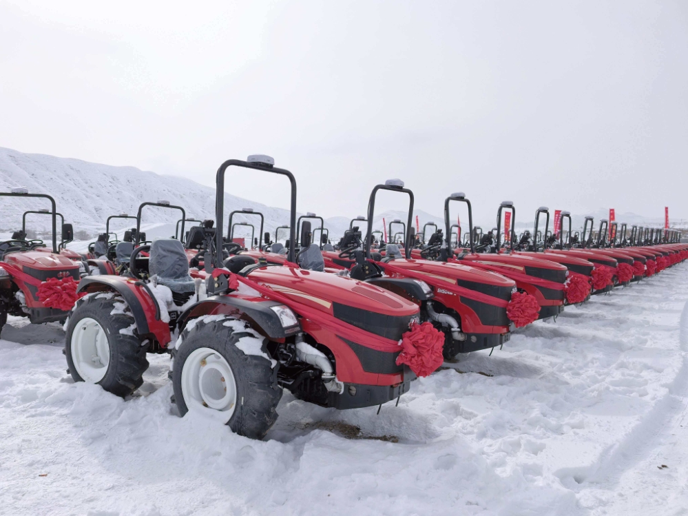 甘肃地形复杂,丘陵山地多。当日投放的机具包括240台丘陵山地折腰转向轮式拖拉机、110台丘陵山地差速转向履带式拖拉机以及160台M垄全膜覆盖种行条孔覆土播种机。这些设备专为复杂地形设计,旨在提升丘陵山区机械化作业水平。