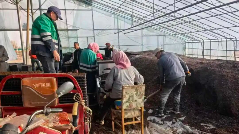 农户们在温室大棚内操作育苗设备,拌土装盘