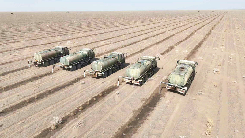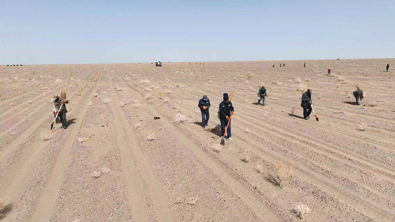 “目前我们正在进行‘三北’工程巩固防沙治沙成果项目的补植补栽和浇灌工作,截至目前已累计种植梭梭、白刺、花棒、胡杨等沙生植物56万亩。”金塔县大漠农林生态产业股份公司副总经理李军祥说。