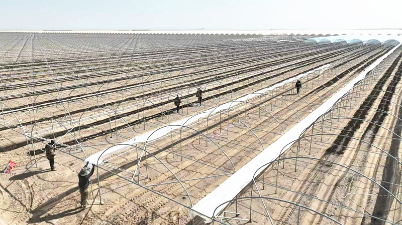 走进金塔县万亩绿色标准化设施瓜菜产业园,一座座崭新的钢架拱棚整齐排列。工人们分工协作,进行钢架安装、棚膜覆盖等作业,每一道工序都有条不紊。得益于去年良好的市场收益,园区企业今年持续加大投入,推进钢架拱棚扩建项目,助力设施农业提质增效。