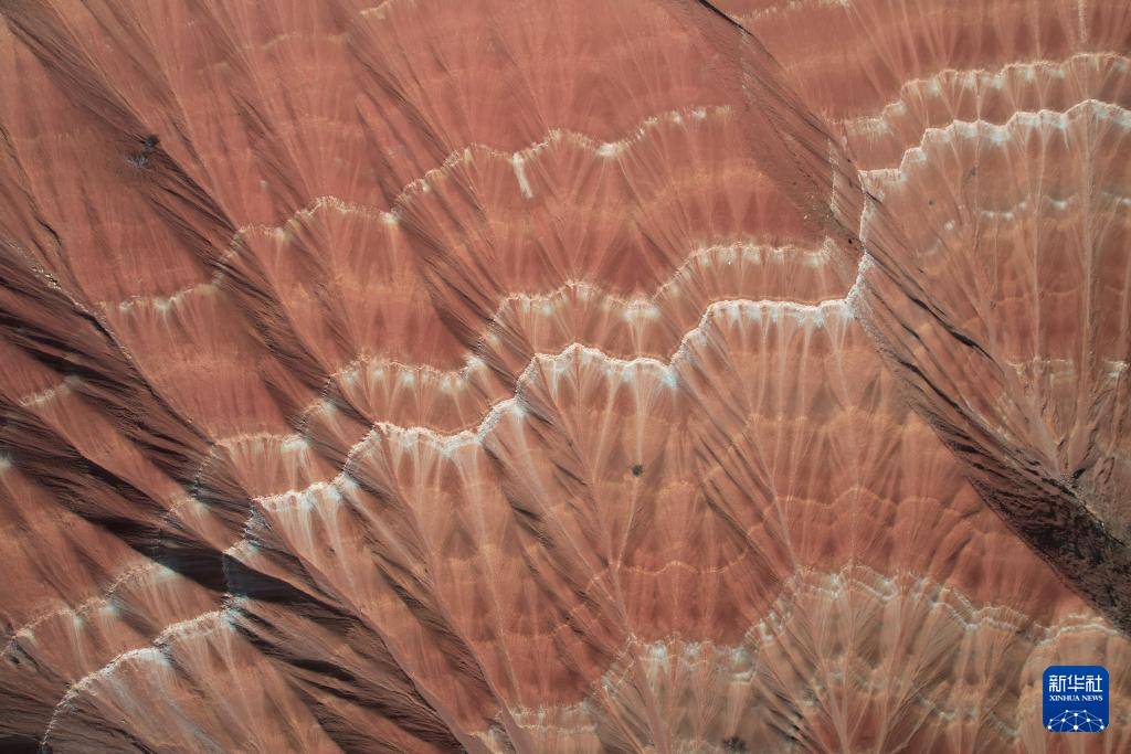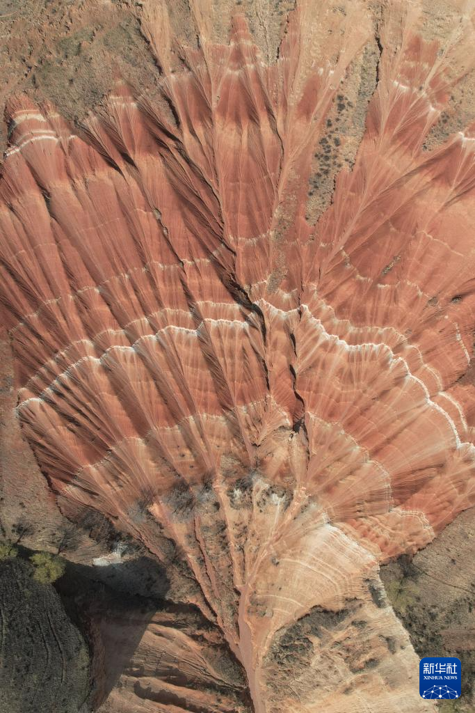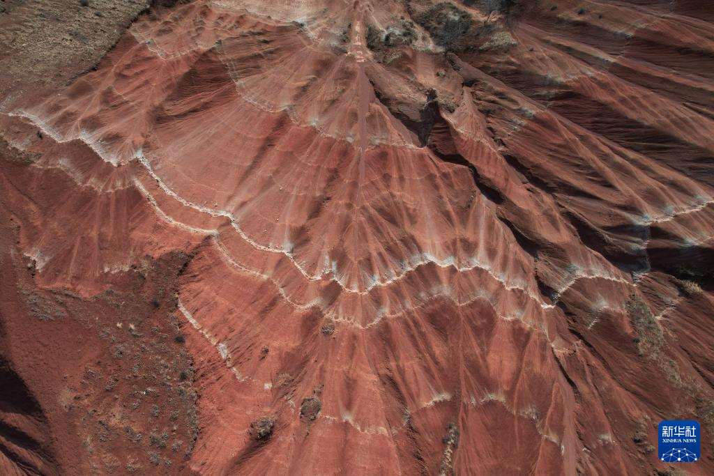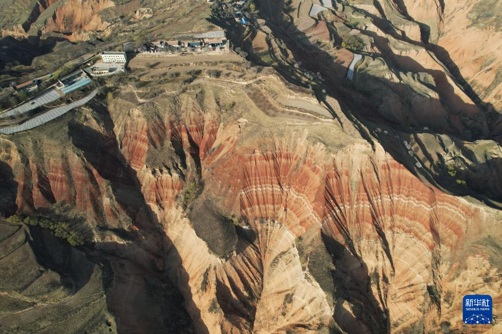 在甘肃省临夏回族自治州东乡族自治县东塬乡境内,有山岭岩层红褐与灰白相间,从高空俯瞰,形似一片片铺开的“羊肉卷”。