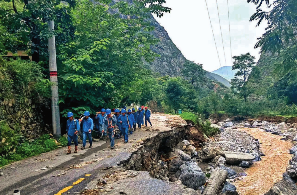 国网陇南供电公司电力抢修队在甘肃省陇南市武都区三河镇花椒沟进行抢修(2024 年 8 月摄) 国网陇南供电公司电力抢修队供图