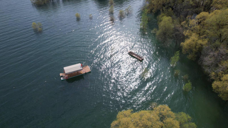 走进黄河三湾,首先映入眼帘的是那一湾清澈见底的河水。阳光洒在水面上,波光粼粼,仿佛撒了一层碎金。河水呈现出翡翠般的碧绿色,倒映着蓝天白云和岸边的杏花树,美得让人挪不开眼。微风拂过,水面泛起细密的涟漪,岸边的花瓣随风飘落,轻轻落在水面上,随波荡漾。