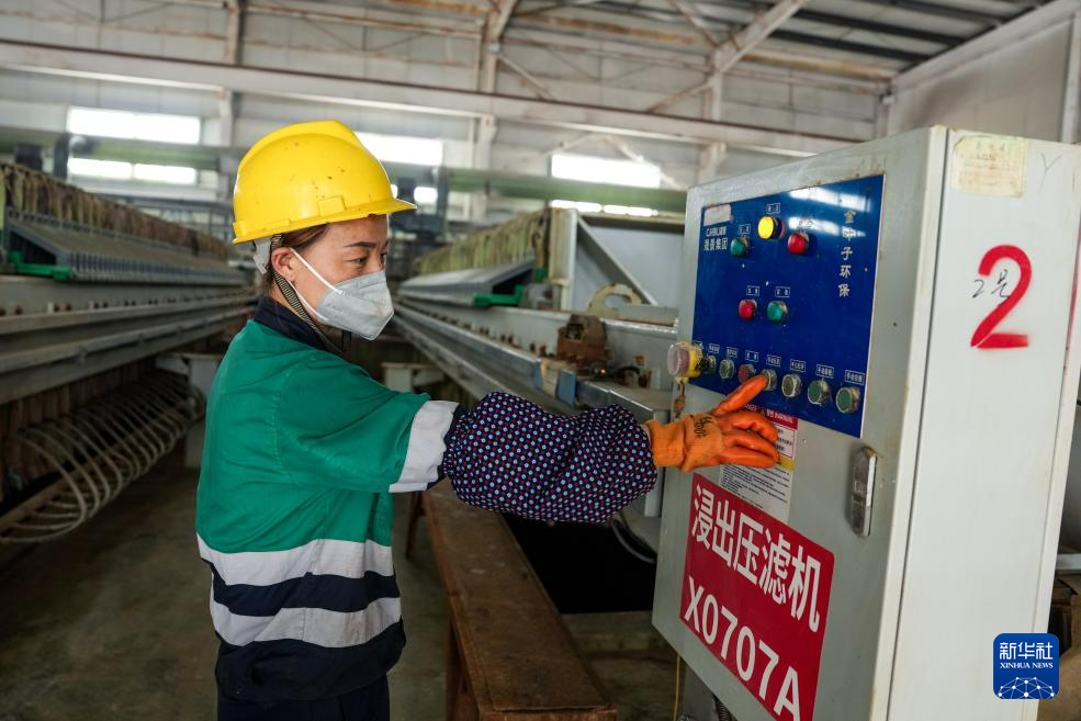 4月13日,在金昌神泥科技有限公司浸出车间,工作人员操作压滤机进行压滤作业。新华社记者 郎兵兵 摄