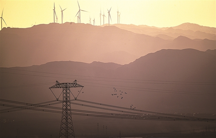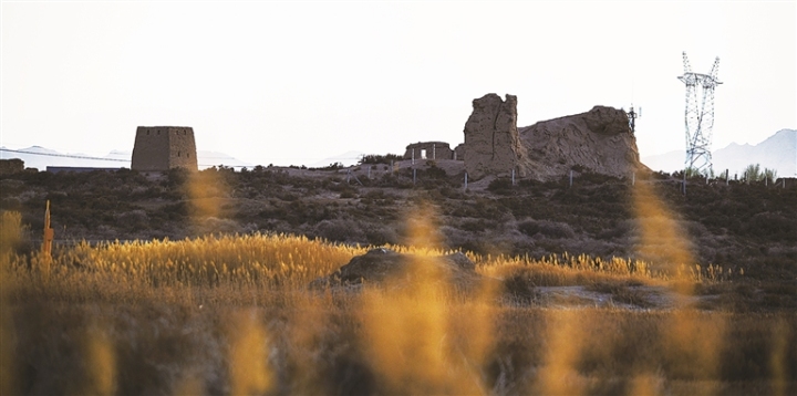湿地之上,水鸟翩跹,野鸭不时掠水而过;岸边古烽燧傲然矗立,如守望丝路古道的卫士,尽显历史厚重与苍茫。远处峰峦连绵,风电、光伏设施与田园村落交相辉映,群鸟凌空盘旋,逆光中勾勒出灵动优美的剪影。