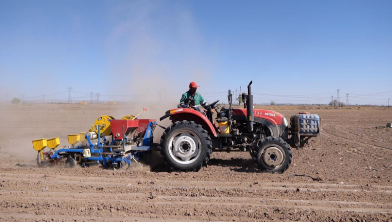 制种玉米产业的稳步发展,正持续带动永昌县种业振兴,也为全县商品玉米种植提供了先进技术支撑和发展经验,推动商品玉米向规模化、科学化种植转型。在水源镇永宁村,种植大户朱玉年的1700多亩商品玉米已进入集中播种阶段,三台大型播种机来回穿梭、机械轰鸣,一颗颗玉米种子被精准播入土壤。作为当地玉米规模化种植的带头人,朱玉年不仅扩大种植规模,更注重科学种植,推广先进种植技术。目前正使用的宽窄行种植技术,按照宽行70厘米、窄行40厘米的标准规范种植,搭配高效滴灌灌溉模式,实现精准供水、科学施肥,既减少水资源和肥料的浪费,又能提升玉米生长质量。“这种种植模式不仅能节省滴灌带和灌溉用水,还能有效改善田间通风透光条件,降低病虫害发生概率,大幅提升种植效率。”朱玉年介绍。
