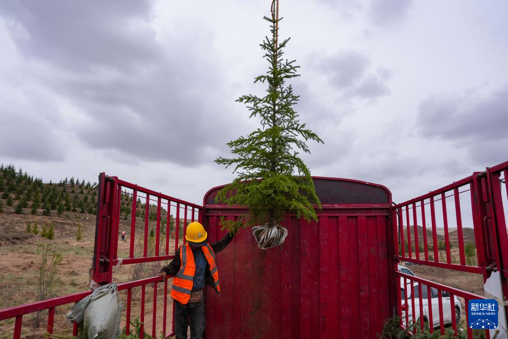 4月27日,兰州新区南部郊野公园一处山坡上,工作人员接收无人机吊运的苗木。新华社记者 郎兵兵 摄