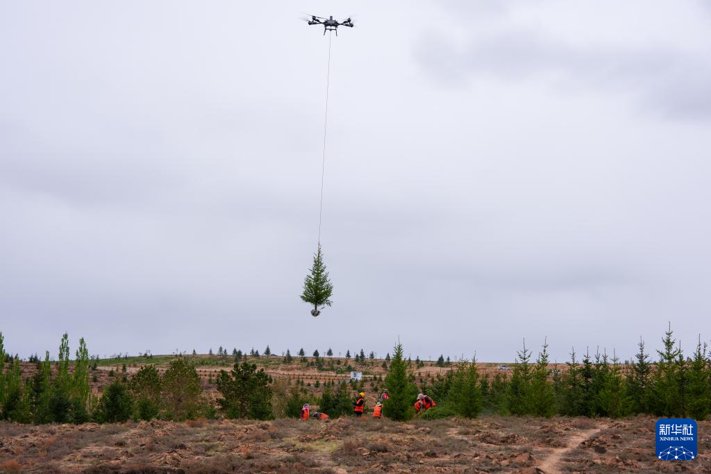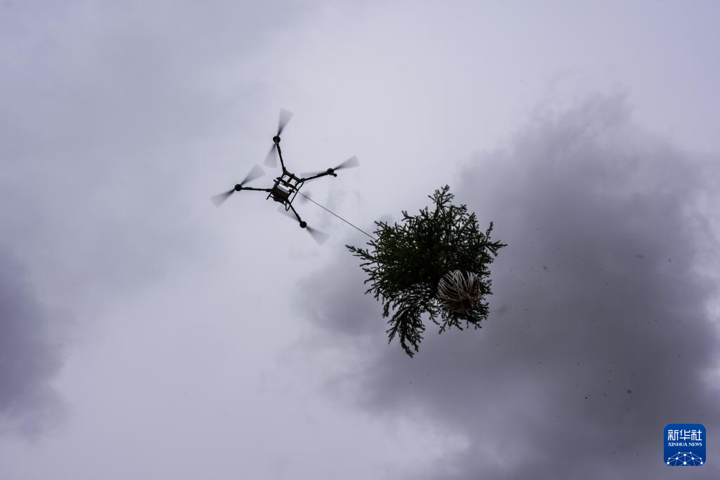 连日来,在兰州新区南部郊野公园2300余亩荒山坡地上,数架植保无人机来回穿梭,精准将苗木吊运至山坡各植树点位,高效助力造林作业。