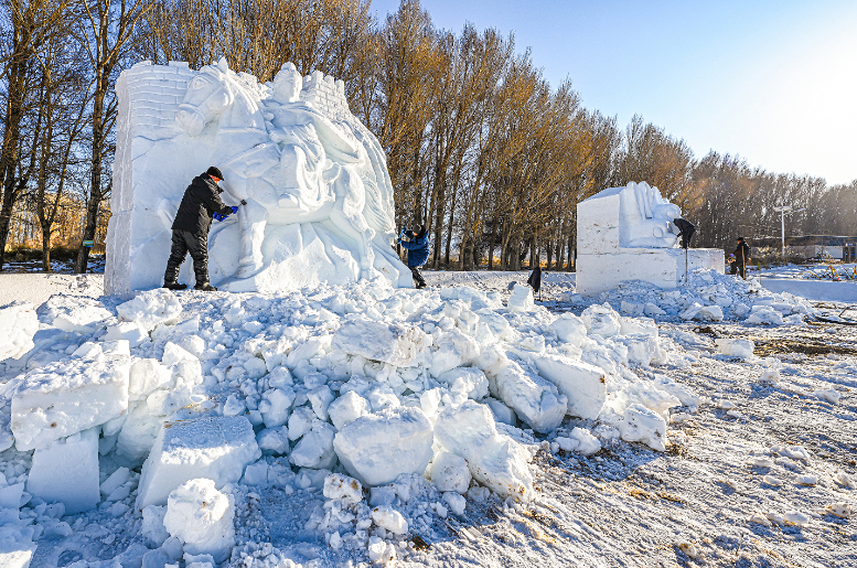 长城脚下雪雕展 马年新春献“贺礼”