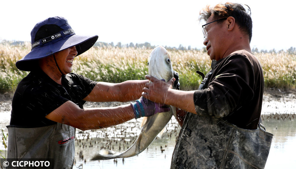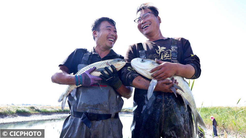 ↑2025年9月26日,在甘肃省张掖市临泽县鸭暖镇古寨村一水产养殖专业合作社鱼蟹养殖基地,党员志愿者同养殖户们在展示捕捞的草鱼。CICPHOTO/王将 摄