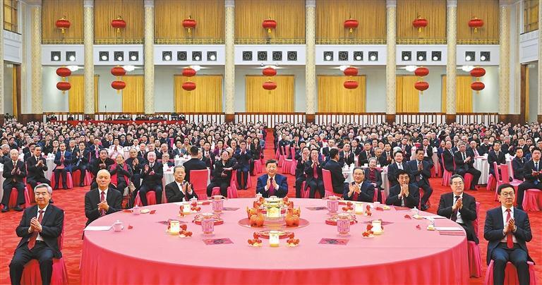 人民大会堂宴会厅灯光璀璨、喜气洋洋,各界人士2000多人欢聚一堂、共迎佳节,现场洋溢着欢乐祥和的节日气氛。